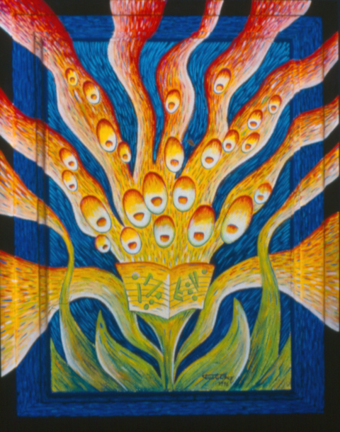 Proposta sviluppata per la rassegna a tema "InCanto nell'Iride" organizzata per festeggiare il venticinquesimo anno di fondazione del Coro Torrefranca di Mattarello. L'interpretazione delle voci del coro richiama una vaga forma floreale senza petali né foglie. E' il suono delle voci che avanza danzando verso l'osservatore staccandosi dal fondo scuro e sfondando il confine della cornice. Ho voluto ritornare ad impiegare tutta l'energia dei colori puri, ed in quest’occasione anche all'uso dell'intera tavolozza. C’è anche un raro ritorno del nero in campitura piena sul bordo della cornice.